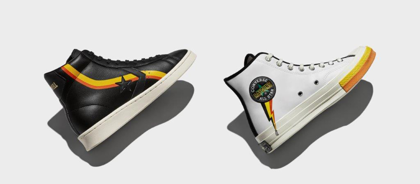 Dressed in retro-inspired orange, yellow, black and white, you can rock your Rayguns allegiance in the Nike Air Force 1 Low, the Nike Air Raid, the high-top Converse All-Star or the Converse Pro Leather.